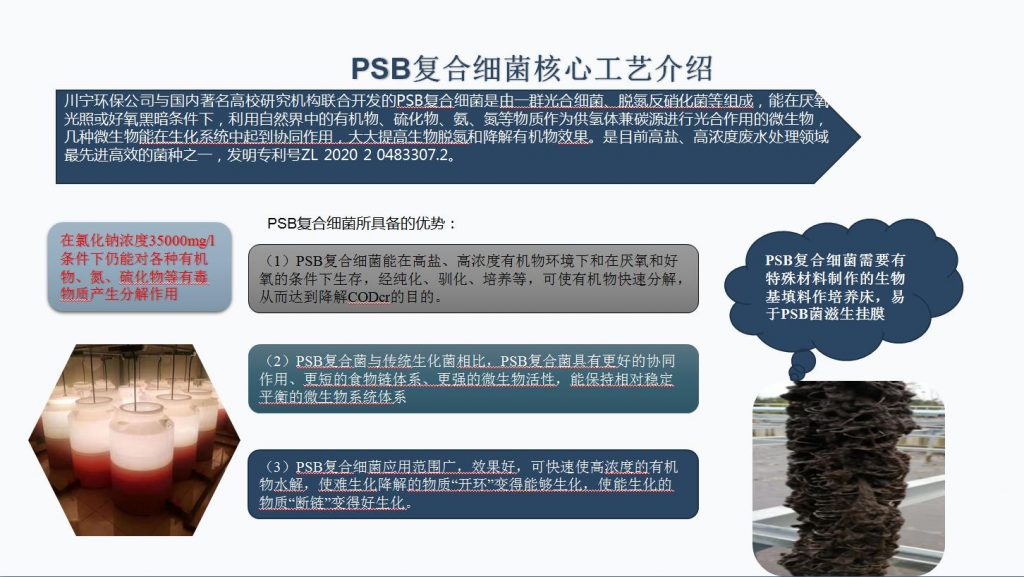 川寧環(huán)保公司與國內(nèi)著名高校研究機構(gòu)聯(lián)合開發(fā)的PSB復(fù)合細(xì)菌是由一群光合細(xì)菌、脫氮反硝化菌等組成,能在厭氧光照或好氧黑暗條件下,利用自然界中的有機物、硫化物、氨、氮等物質(zhì)作為供氫體兼碳源進行光合作用的微生物,幾種微生物能在生化系統(tǒng)中起到協(xié)同作用,大大提高生物脫氮和降解有機物效果。是目前高鹽、高濃度廢水處理領(lǐng)域最先進高效的菌種之一,發(fā)明專利號ZL 2020 2 0483307.2。